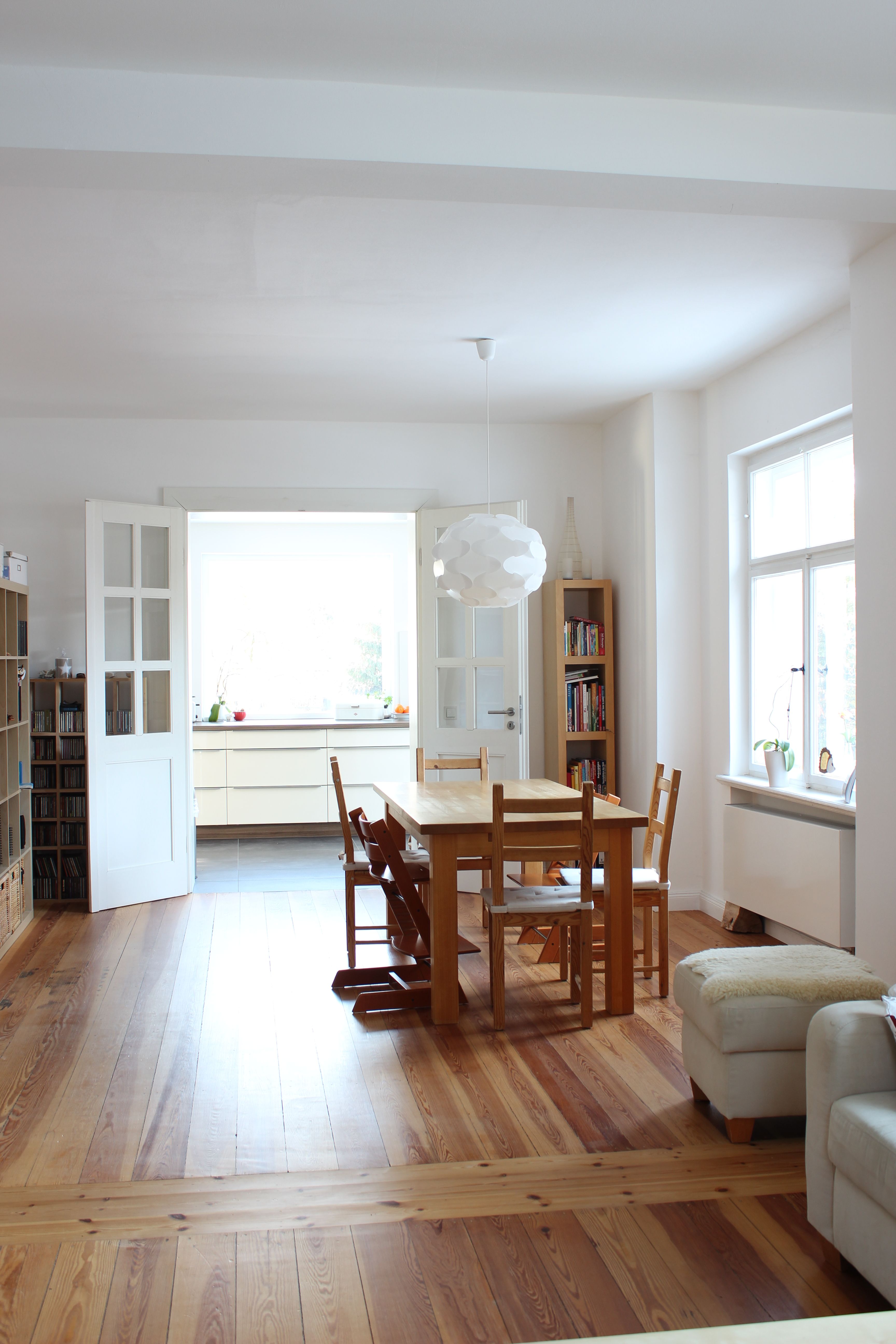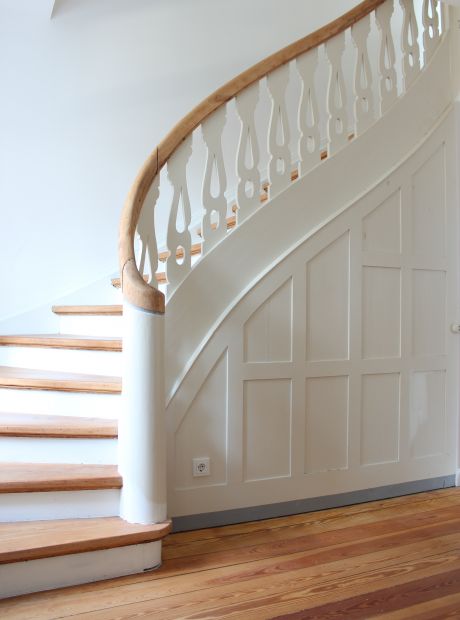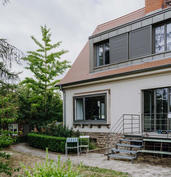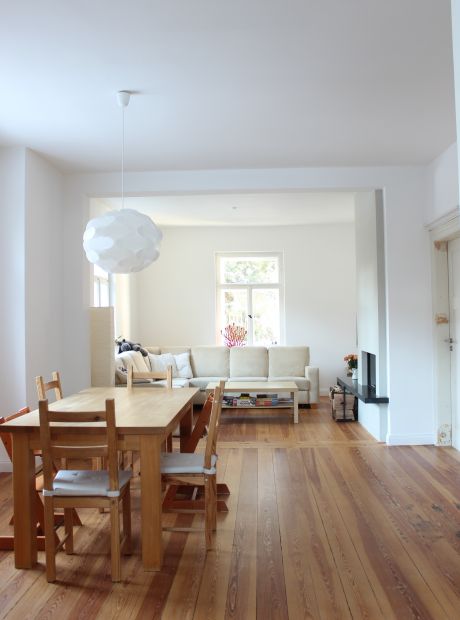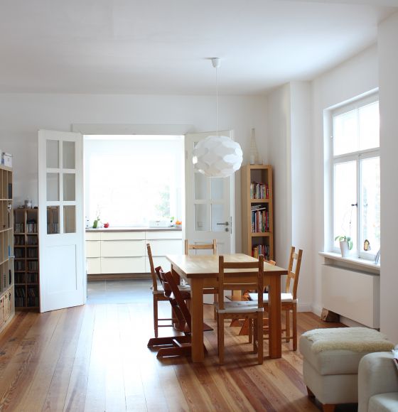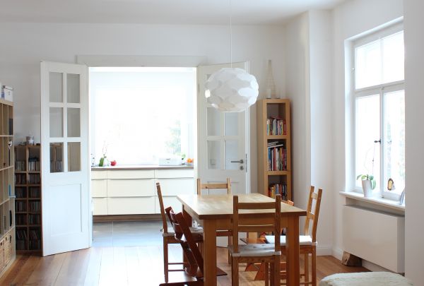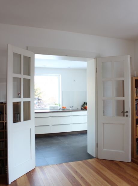 Die Doppelhaushälfte aus den 1920er Jahren am Stadtrand Weimars war beim Kauf gut erhalten und durch eine Arztpraxis genutzt. Diese musste rückgebaut werden. Wir konnten die schönen Details, wie die Innentreppe, die Füllungstüren mit den originalen Türklinken, die Kastenfenster und die Böden aufarbeiten. Im Obergeschoss wurden zwei neue Bäder eingebaut und aus zwei kleinen Räumen ein großes Kinderzimmer geschaffen. Im ehemaligen Wintergarten wurde die Küche mit Blick und Zugang direkt zum Garten angeordnet.