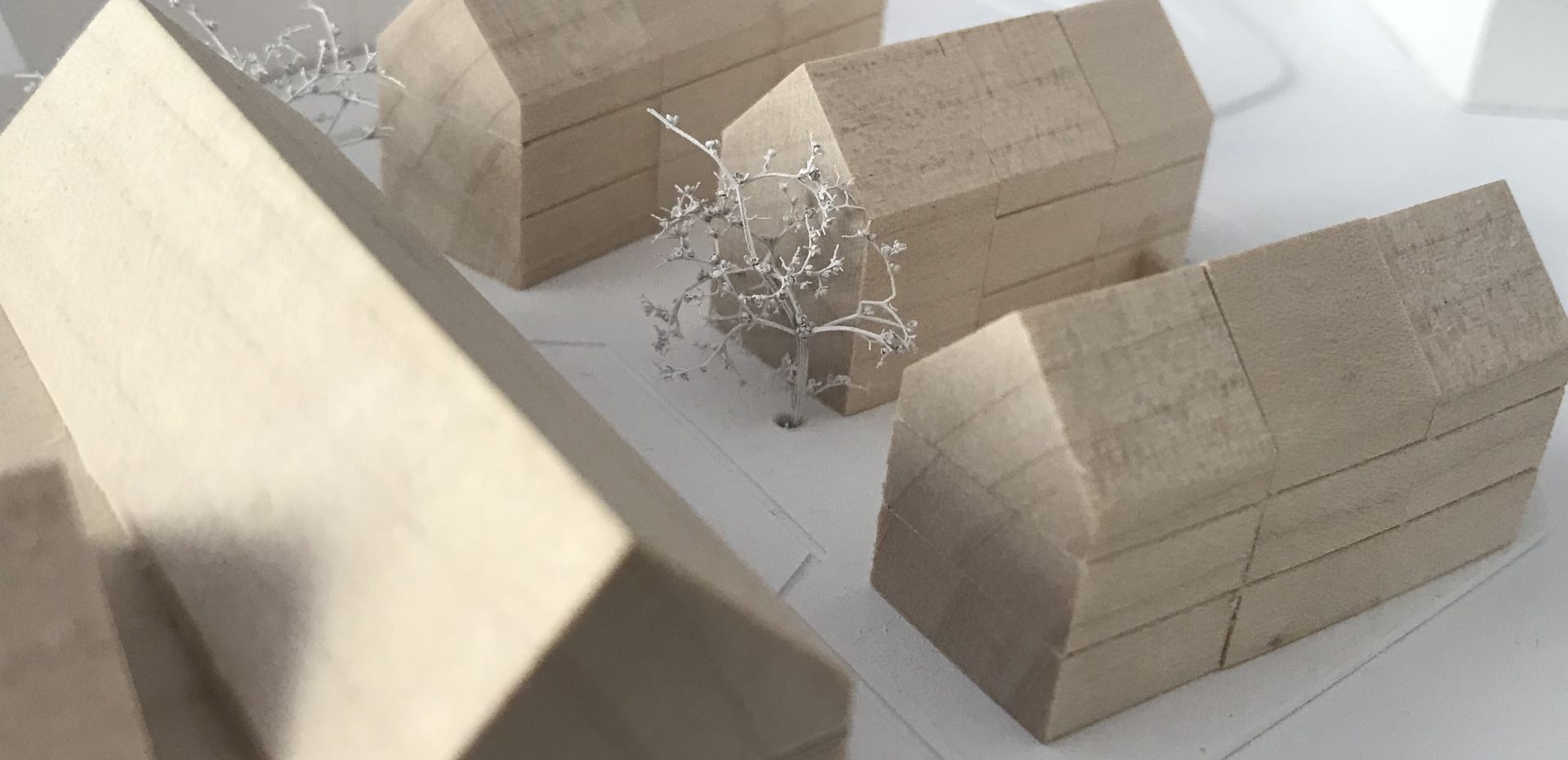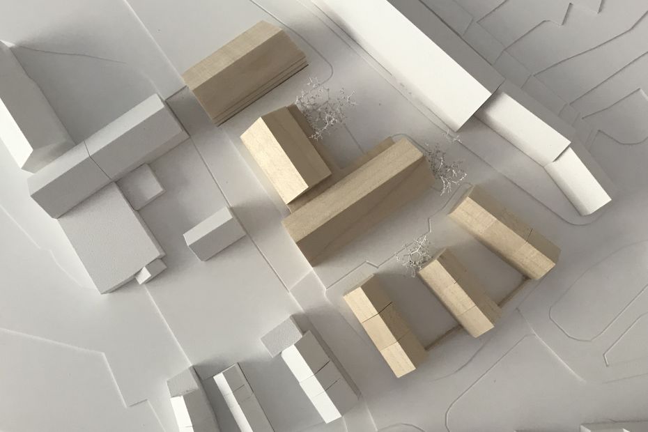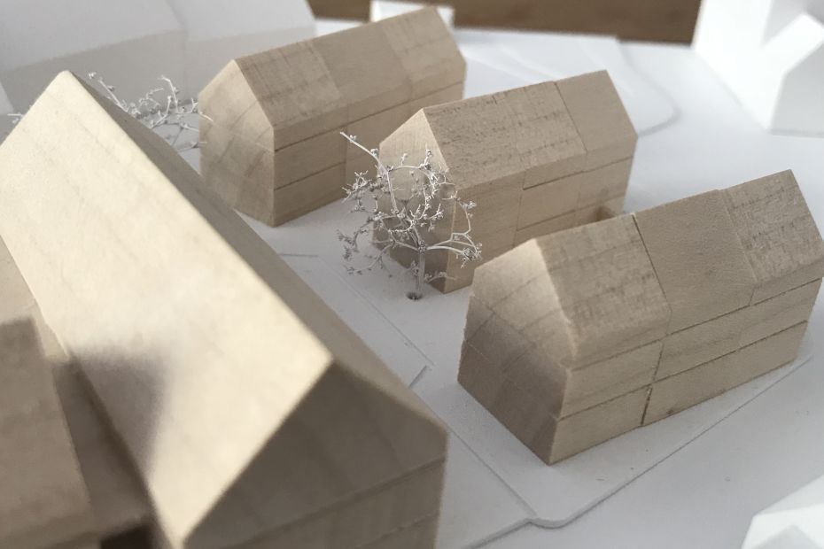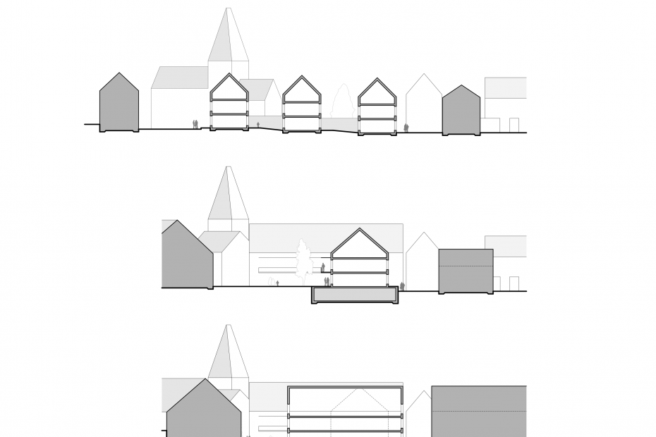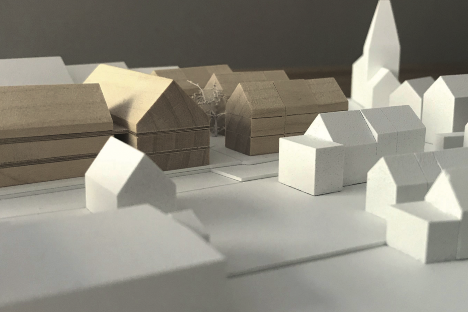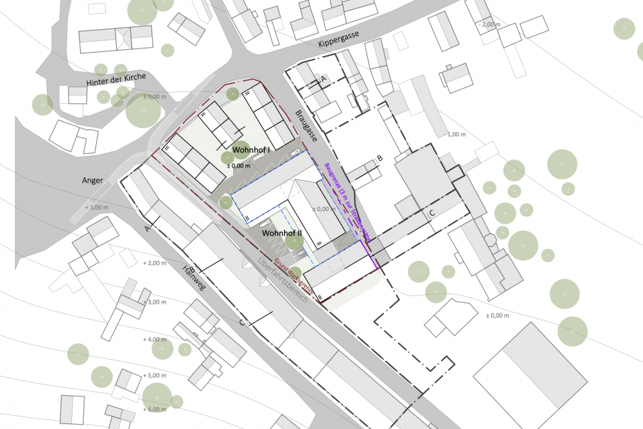 In dieser Machbarkeitsstudie sollen die Optionen einer Neubebauung untersucht werden. Zusammen mit dem städtebaulichen Rahmenplan der Stadt Weimar entsteht die Idee zur Wohnbebauung aus sechs Mehrfamilienhäusern, die zwei Wohnhöfe formen, die in ihrer Art und Gestaltung sehr unterschiedlich ausfallen. Der zu Anger und Kirche orientierte Wohnhof ist durch drei schmale giebelständige Wohnhäuser geprägt, die sich in Kubatur und Formensprache in die gebaute Umgebung integrieren. Sie sind vertikal in Reihenhäuser untergliedert, die jeweils einen eigenen Zugang haben und über eine Terrasse zur gemeinsam genutzten Grünfläche verfügen. Der zweite Wohnhof wird von drei Gebäuden umschlossen. Die zweigeschossigen Baukörper mit ausgebautem Dachgeschoss werden durch einen Lauben-/Balkongang erschlossen und sind durch eine gemeinschaftlich genutzte Tiefgarage mit 25 Stellplätzen miteinander verbunden. Insgesamt sind in der Tiefgarage und in der Außenanlage ca. 35 Stellplätze umsetzbar. Insgesamt sind ca. 3.300 qm Wohnfläche geplant, wobei die Wohnungsgrößen zwischen 65 und 145 qm variieren. Diese Wohnungen sind sowohl für ältere und alleinstehende Bewohner attraktiv als auch für Familien, die das Wohnen in ländlicher Umgebung bevorzugen. Die Wohnungsstruktur ist bewusst so gewählt, dass hier eine hohe Nutzerdurchmischung möglich ist.