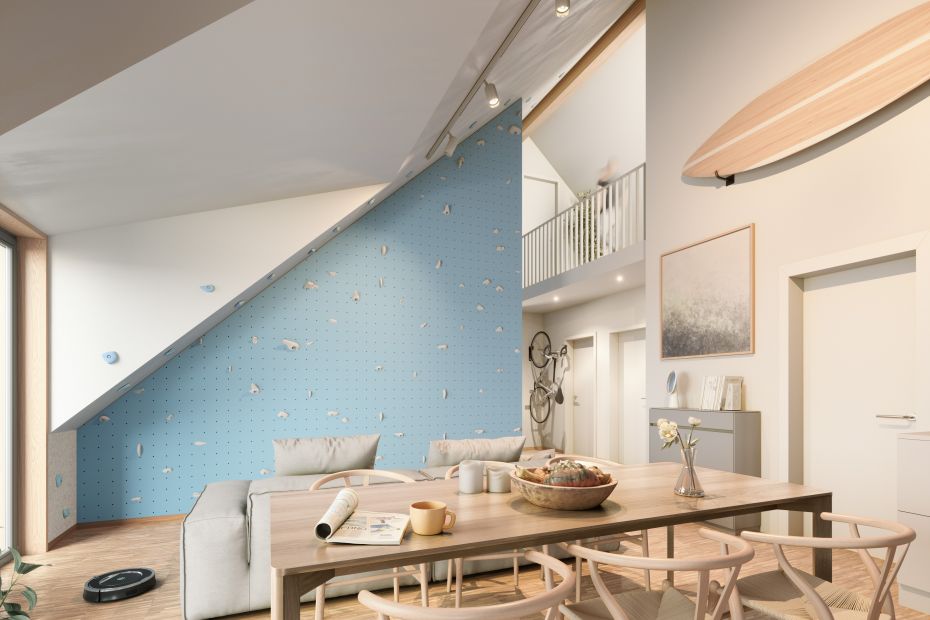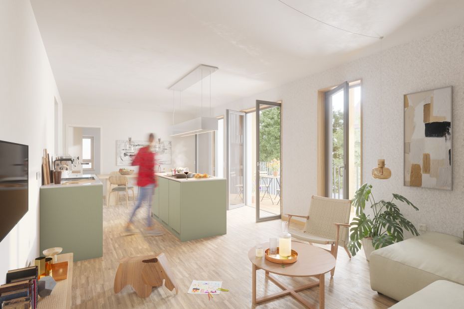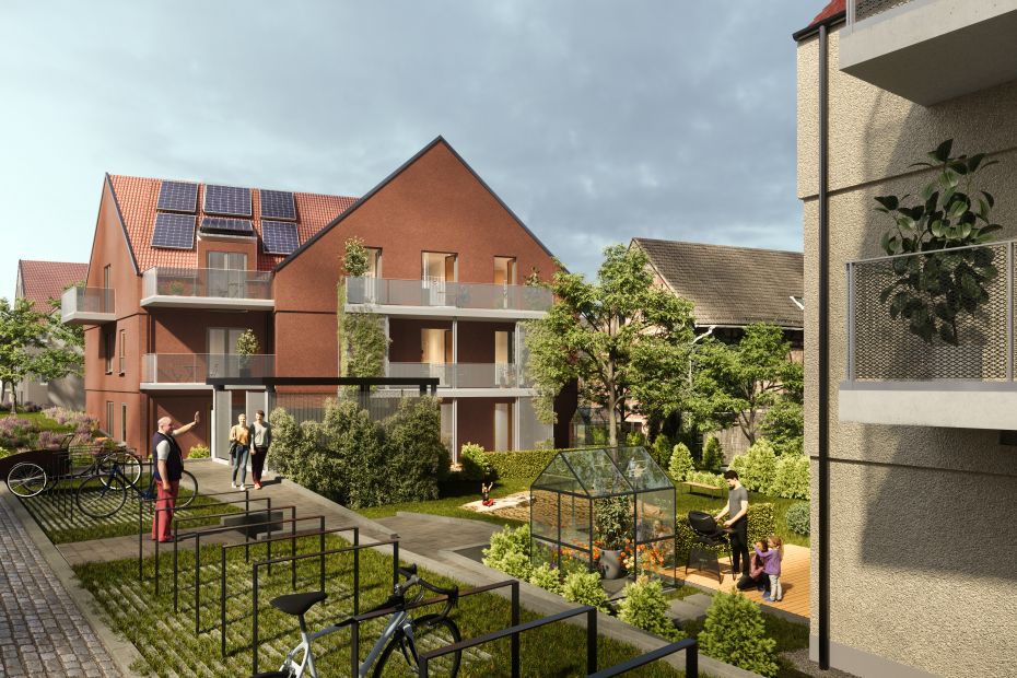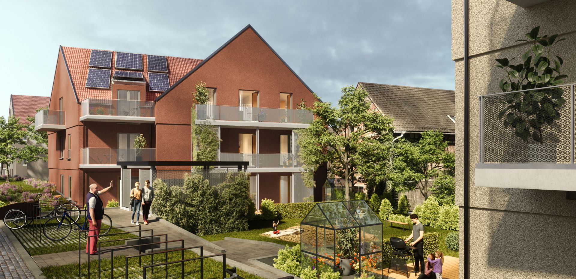 Unweit des Weimarer Zentrums liegt das Baugrundstück auf dem ehemaligen Areal der gleichnamigen Brauerei mit direktem Anschluss an den Anger. Hier soll ein durchmischtes Wohnquartier mit 65 unterschiedlich großen Wohneinheiten entstehen, welche sich auf sechs Mehrfamilienhäuser verteilen und von einer gemeinsamen Mobilitätsetage profitieren. Die sechs Wohnhäuser ordnen sich mit den zwei bis drei Vollgeschossen und den spitzen Satteldächern in die Umgebungsbebauung ein. Die Fassadengestaltung greift die ortstypischen Themen aus Travertin, Holz und Backstein auf und übersetzt diese in die Struktur und Farbgebung der Putzfassade. In der vielseitigen Außenanlage entstehen sowohl private Gärten, als auch gemeinschaftlich genutzte Freibereiche. Das gesamte Quartier erhält das Qualitätssiegel Nachhaltiger Wohnungsbau und wird als KfW Effizienzhaus Stufe 40 mit Nachhaltigkeits-Klasse gebaut.