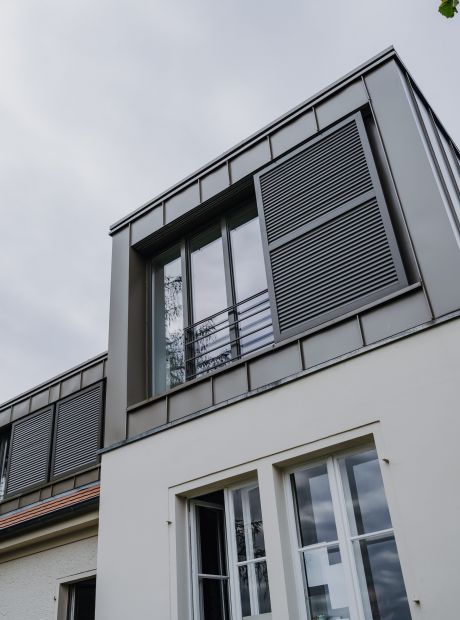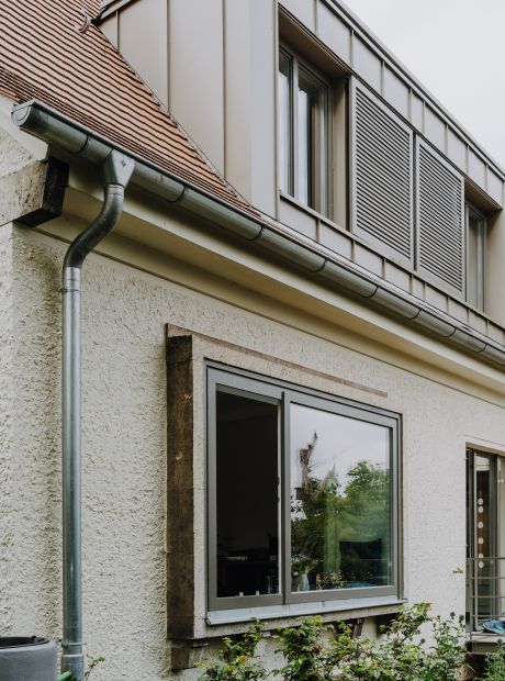 Beim Wohnhaus W handelt es sich um die Sanierung eines freistehenden Einfamilienhauses aus den späten 1950er Jahren. Die vorgefundenen Grundrisse zeichneten sich durch Großzügigkeit und klare Strukturen in der Funktionszuordnung aus. Es gab einige erhaltenswerte Gestaltungsmerkmale an der Fassade aus Travertin und Betonfertigteilen, welche aufgearbeitet wurden, wie auch die Kastenfenster und die Verbundfenster mit Bleiglaseinsätzen. Neben der Sanierung der Gebäudehülle, war die Hauptaufgabe, die innere räumliche Struktur den Bedürfnissen der neuen Hausbewohner anzupassen. Im Erdgeschoss erhielt die Küche einen Ausgang zum Garten. Sie wurde zum Essbereich hin geöffnet, um mehr Bewegungsraum und eine Belichtung von Süden her durch die Raumflucht zu erhalten. Im Dachgeschoss wurde die Raumstruktur komplett verändert, um drei Kinderzimmer, ein Schlafzimmer und ein großes Bad zu schaffen. Hierfür haben wir die vorhandenen kleinen Gaupen durch zwei große ersetzt und das Nord-West-Zimmer um die Fläche des ehemaligen Balkons durch das Aufsetzen eines Kubus in Holzbauweise vergrößert.