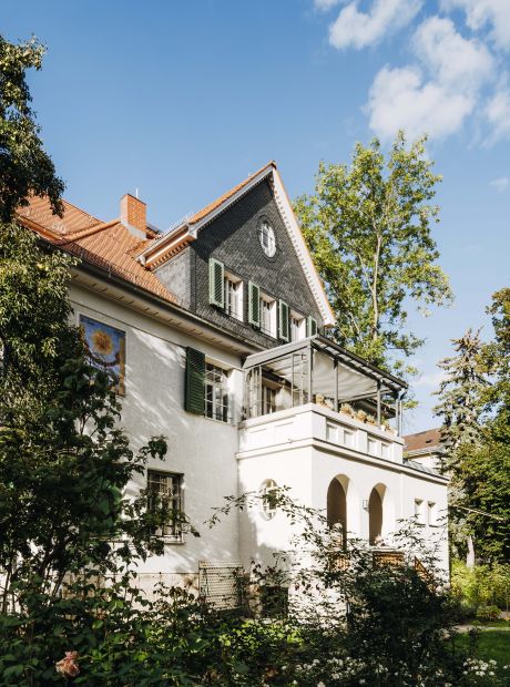 Die Grundstruktur im Inneren des Hauses, sowie die Einbauten, wie Türen, Treppen war weitestgehend erhalten, ebenso die Fenster mit Fenster- und Rolläden, besondere Fassadenelemente, wie eine Sonnenuhr, besondere Tür- und Fenstergewände, sowie die Schieferwandverkleidung der Gaupen und Erker. Die Villa mit Garten und Zaunanlage steht unter Denkmalschutz. Die Aufgabe bestand darin, das Einfamilienhaus in ein Mehrfamilienhaus umzubauen und dabei die vorhandee Raumstruktur, sowie die gut erhaltene Substanz mit allen vorhandenen Details zu erhalten und wieder erlebbar zu machen mit einem hohen Anspruch an die Ausstattung und Gestaltung der zukünftigen Wohnungen. Wir haben ein neues Treppenhaus eingebaut und die Villa nach Osten um einen Anbau erweitert, um die vier neuen Wohnungen optimal erschließen und die ursprüngliche Struktur der repräsentativen Räume erhalten zu können. Es wurden zum großen Teil die Kastenfenster und sämtliche Innentüren, Wandvertäfelungen, etc. aufgearbeitet. Bei den Ausbau- und Sanierungsdetails haben wir uns in der Herangehensweise am Reformstil orientiert und diese mit zeitgemäßen Materialien umgesetzt. Der Fassadenputz wurde rekonstruiert. An den Zwerchhäusern und dem Eingangserker wurden die verwendbaren, abgenommenen Schieferplatten als Fassadenverkleisung wieder angebracht und im gleichen Format durch neue Platten ergänzt. Der neue Anbau wurde dezent auf der Gartenseite angesetzt. Der Fassadeputz und die Natursteinsockelverkeidung führen die Altbaufassade fort und unterscheiden sich nur in der Oberflächenstruktur. Im Garten wurden die vorgefundenen Wegeachsen rekonstruiert unter Verwendung der historischen Wegerandsteine und Pflasterung. Die Zaunanlage zur Jahnstraße wurde anhand der historischen Zeichung ebenfalls rekonstruiert.