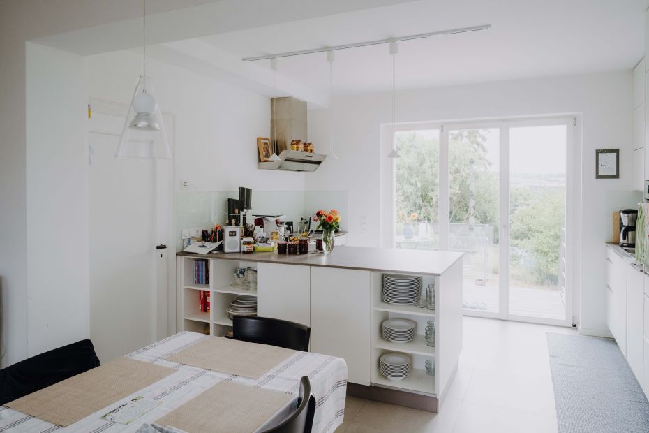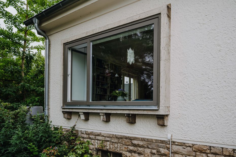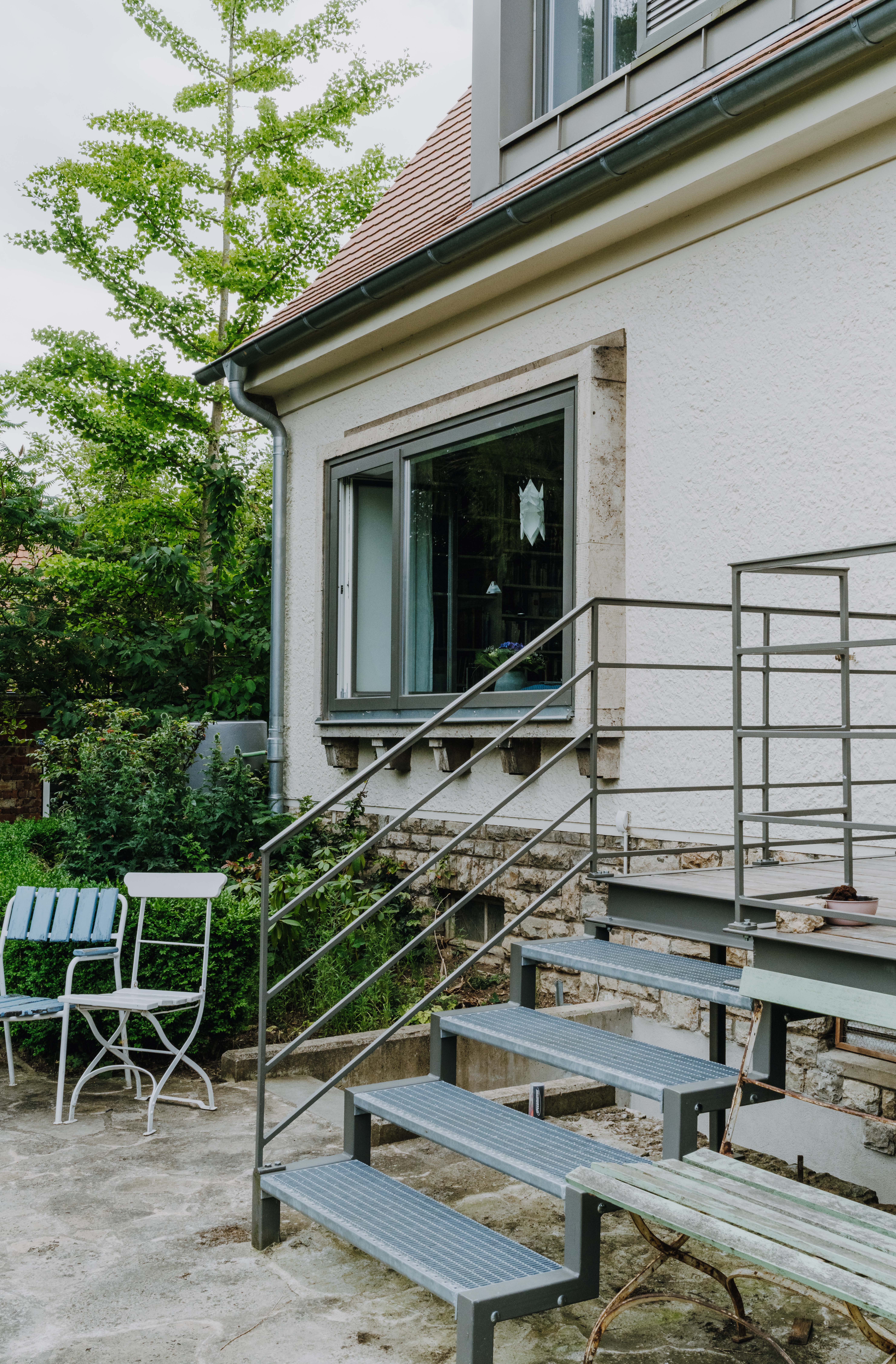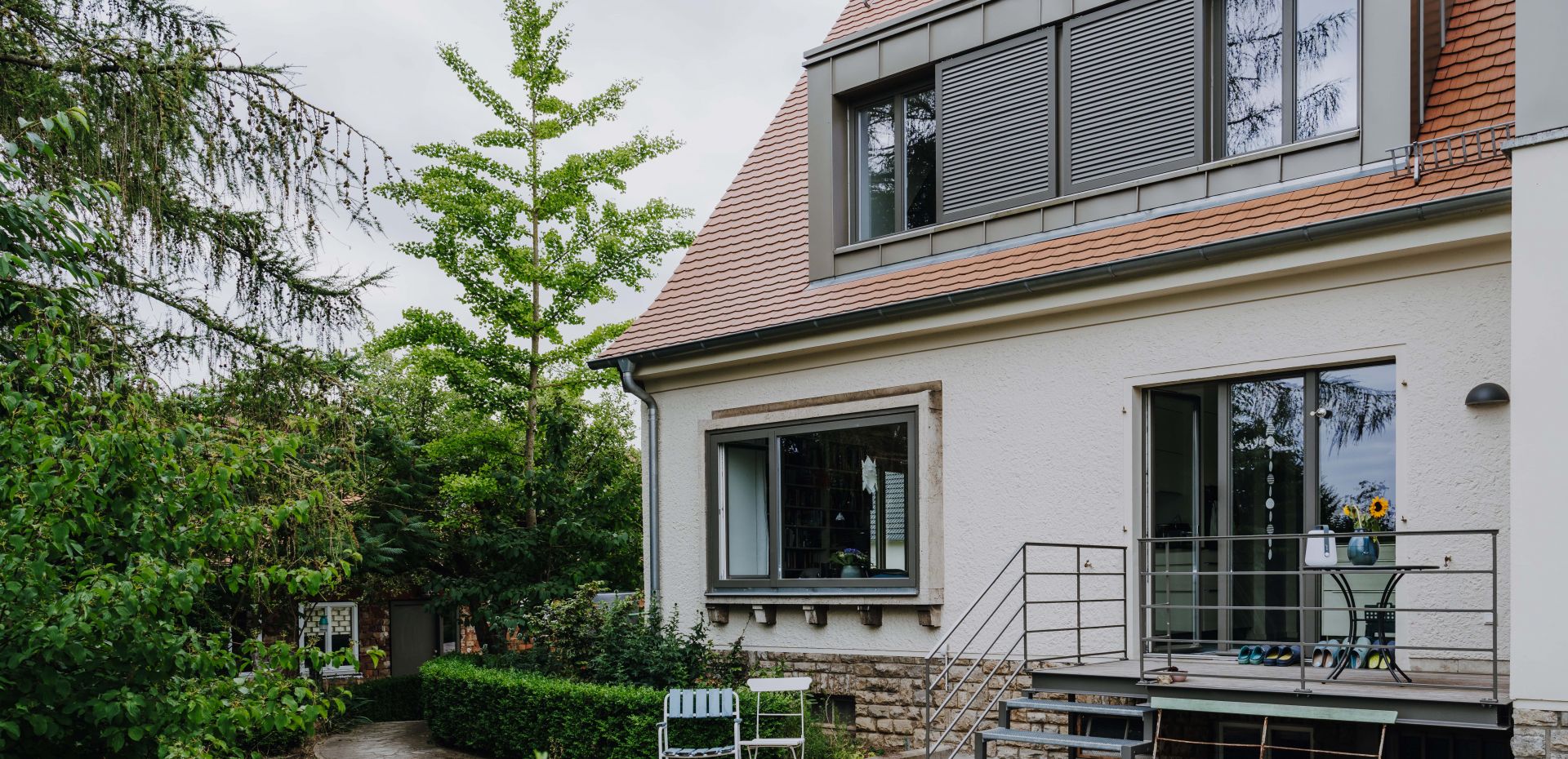Beim Wohnhaus W handelt es sich um die Sanierung eines freistehenden Einfamilienhauses aus den späten 1950er Jahren. Die vorgefundenen Grundrisse zeichneten sich durch Großzügigkeit und klare Strukturen in der Funktionszuordnung aus. Es gab einige erhaltenswerte Gestaltungsmerkmale an der Fassade aus Travertin und Betonfertigteilen, welche aufgearbeitet wurden, wie auch die Kastenfenster und die Verbundfenster mit Bleiglaseinsätzen. Neben der Sanierung der Gebäudehülle, war die Hauptaufgabe, die innere räumliche Struktur den Bedürfnissen der neuen Hausbewohner anzupassen. Im Erdgeschoss erhielt die Küche einen Ausgang zum Garten. Sie wurde zum Essbereich hin geöffnet, um mehr Bewegungsraum und eine Belichtung von Süden her durch die Raumflucht zu erhalten. Im Dachgeschoss wurde die Raumstruktur komplett verändert, um drei Kinderzimmer, ein Schlafzimmer und ein großes Bad zu schaffen. Hierfür haben wir die vorhandenen kleinen Gaupen durch zwei große ersetzt und das Nord-West-Zimmer um die Fläche des ehemaligen Balkons durch das Aufsetzen eines Kubus in Holzbauweise vergrößert.